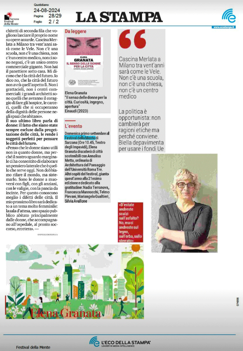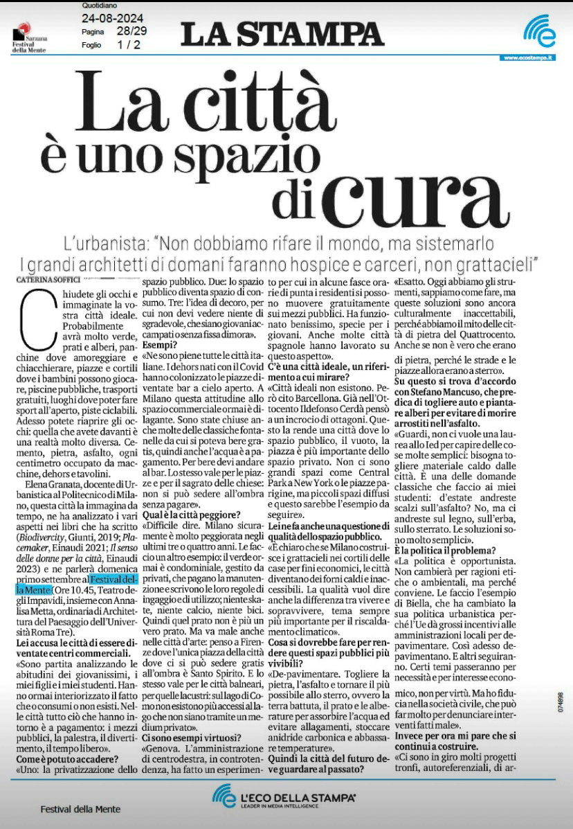 _____L'articolo di Caterina Soffici, intervista a Elena Granata, La Stampa 24 agosto 2024 Condividi il post PLANET BAll author postsArticoli correlati 15 ottobre 2025La valle del Gran Paradiso va ascoltata, non urbanizzata [Linkiesta, 2025]by Elena Granata 9 giugno 2025CASA Piccolo alfabeto dell’abitare [Città Nuova, 2013]by PLANET B 9 giugno 2025LA MACCHINA DEL TEMPO Leggere la città europea contemporanea [Marinotti, 2011]by PLANET B 9 giugno 2025LA MENTE CHE CAMMINA Esperienze e luoghi [Maggioli, 2012]by PLANET B 9 giugno 2025AMOR LOCI Suolo, ambiente, cultura civile [Raffaello Cortina Editore, 2012]by PLANET B 9 giugno 2025TEEN IMMIGRATION La grande migrazione dei ragazzini [Vita e Pensiero, 2019]by PLANET B PrecedenteProssimo
